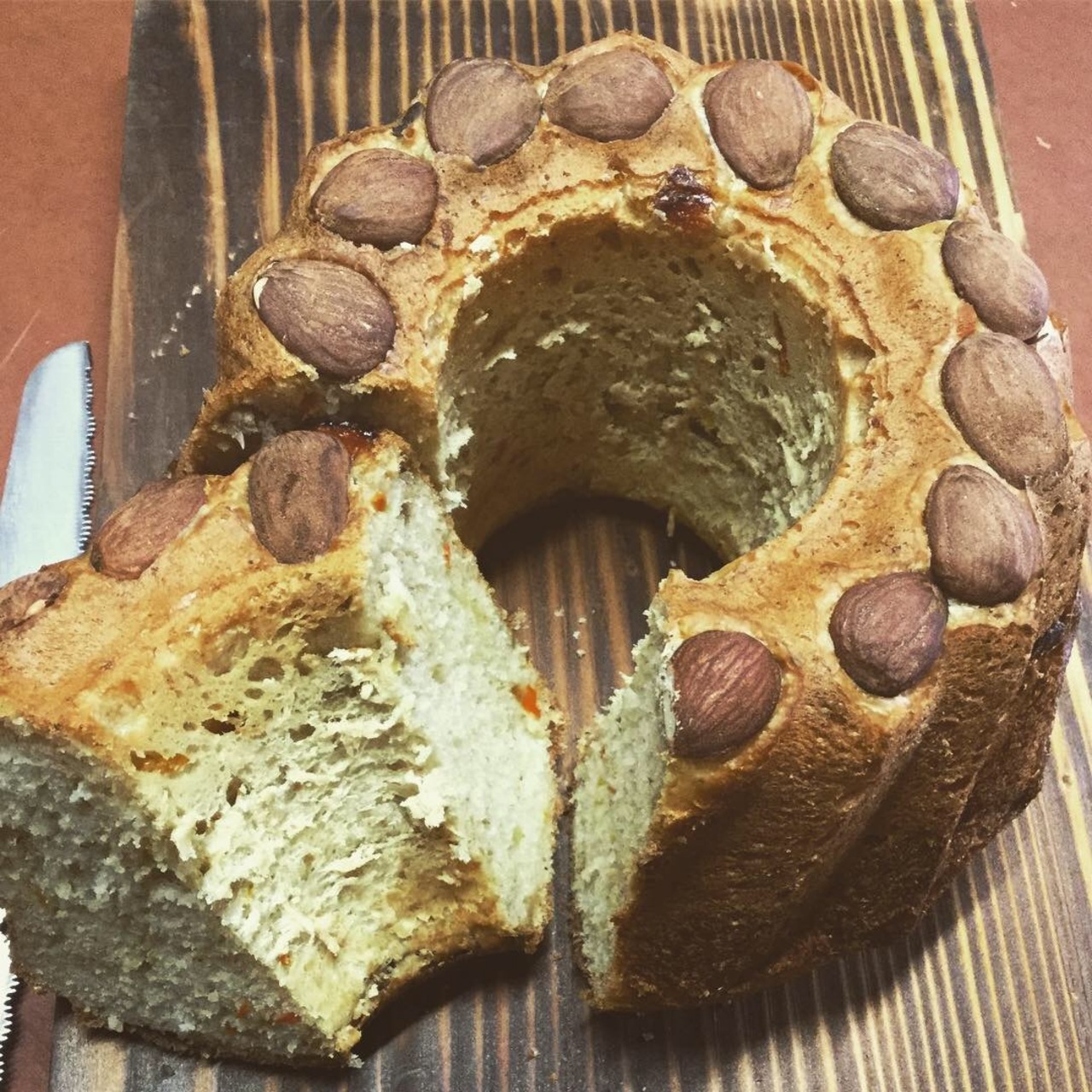 *卵乳製品トランス脂肪酸含む油脂(自家製国産豚肉ベーコンビッツを除く)白砂糖不使用の甘くないクグロフ(王冠型の発酵菓子風酵母ぱん)。