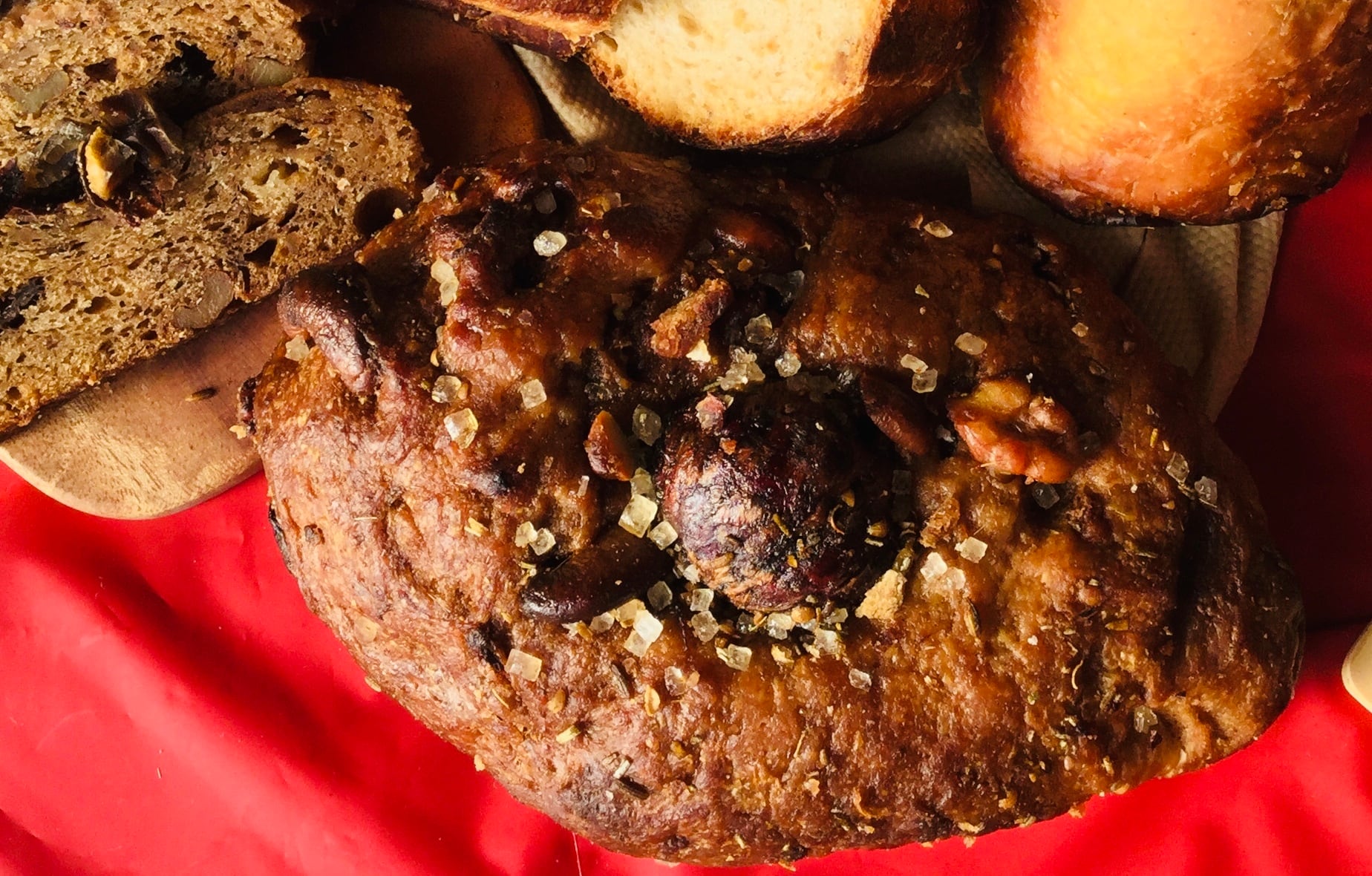 九州産小麦&国産ライ麦で作る自家製酵母生地に自家製フルーツミンツ(イエーガーマイスター漬)と自家製希少糖フルーツスプレッド、胡桃、国産皮付落花生を散りばめた一年間の山の恵みが詰まった年1回スペシャリテメニュー!